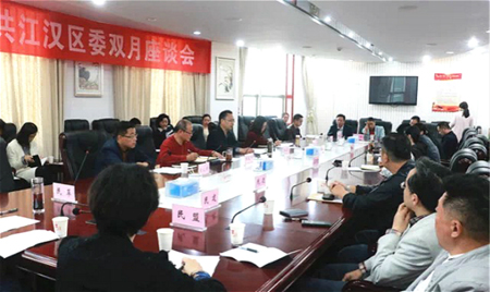 4月16日下午,中共武汉市江汉区委围绕“中山大道文化旅游产业建设”议题召开了2018年第一次双月座谈会。区委常委张显军,区政府副区长、区民建副主委陆慧,市属党外挂职干部代表,区委办、区委统战部、区政府研究室、区文化局负责人等出席座谈会。民建江汉区委专职副主委郑宏高参加座谈。