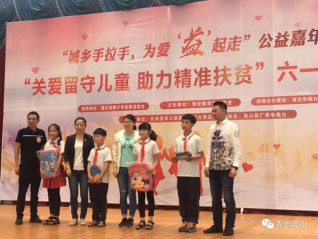 6月1日,“城乡手拉手,为爱益起走”公益嘉年华暨“关爱留守儿童助力精准扶贫”六一特别活动在英山县举行。民建武汉市东西湖区会员熊善清、武汉11个城市爱心家庭以及孔家坊乡难作堰小学的54名留守儿童等参加活动。