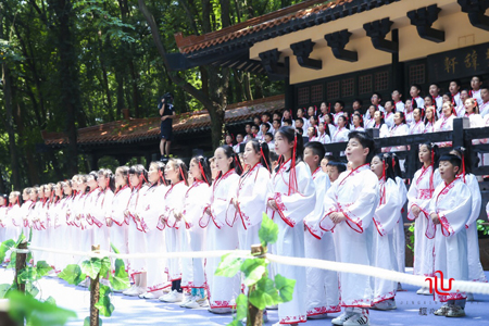 在经心书院分会场,100 名小学生在经心书院山长郭齐勇教授的带领下,端坐于古式案几前学习《离骚》。悠扬的古琴声中,书法家孟庆星在长达17米的卷幅上用笔墨诉说情怀,书写《离骚》全文。于文华泛舟东湖缓缓而来,伴随着悠扬婉转的笛箫声登上主舞台,将《离骚》选段谱写成歌曲现场演唱。经典诗作重新谱曲,保留极其丰富的古代音乐文化遗韵,余音绕梁,仿佛回到了两千多年前的荆楚大地。现场连线秭归屈原祠以及夷陵区张家口小学分会场,来自秭归两所学校1800名学生摆成“楚辞”队形,齐声背诵《离骚》选段。