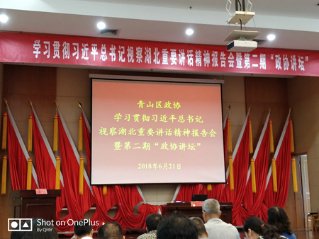 6月21日上午,青山区政协组织区全体政协委员参加区政协第二期“政协论坛”,学习贯彻习近平总书记视察湖北重要讲话精神。民建青山区工委副主委屈鸿雁及部分会员参加学习活动。