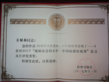 近日,由民建武汉市直新洲区支部会员吕继强撰写的《100多次失望后,一个微信号出现了》一稿,荣获中检报业集团、检察日报社“砥砺奋进的五年·中国检察好故事”征文优秀奖。