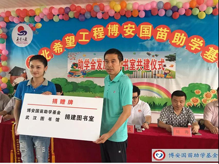 熊善清为贫困学生发放了助学金,博安国苗助学基金携手武汉图书馆向茅山中心小学捐建图书室,徐蕾向博安国苗助学基金回赠了锦旗。