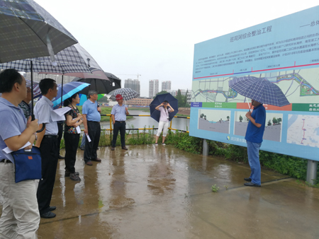 督察组冒雨仔细聆听区水务局局长金桥的汇报。由于前期中央环保督察复查曝光了巡司河治污截留不力等问题,洪山区水务局在反复拉网式排查巡司河周边私接乱排的排污口统一强力截断,制定全线截流措施,配合市级巡司河综合整治项目,同步配套截流管网建设,预计到8月底前完成二期渠道全线过水断面及边坡绿化,彻底改变岸线杂乱现状,并争取2019年底完成景观公园的施工,使巡司河江河联通,水体水质逐步改善,河港将重换新颜。在东湖港、东杨港综合整治现场,督察组在观看了市海绵公司的沙盘总体汇报后冒雨视察了东湖港的整治效果。