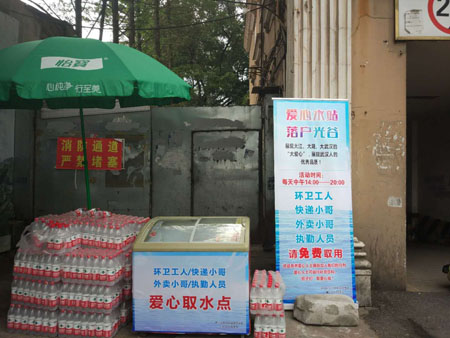 8月19日,民建武汉市洪山区会员何成辉、李享元等自筹经费,在武汉市人流量最大的光谷广场民族大道一侧,购买瓶装水和冰柜,设立爱心水站,为在烈日下坚持户外工作的环卫工人、快递小哥、外卖小哥和其他有需要的人群等免费送水(自取自用)。