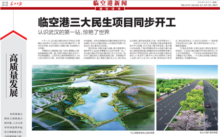 9月12日,《长江日报》第22版用整版篇幅报导了武汉临空港同时开工的三大民生项目。这三个项目是:总投资8亿元省级杜公湖湿地公园、上百公里东西湖环区绿道、协和东西湖医院新大楼二期工程。它们于9月11日同时开工建设,标志这三大民生工程进入了重要的具体实施阶段。
