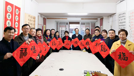 12月22日,民建武汉市武昌区经管支部特邀区民建常委、武昌区书法家协会副主席秦元昌为支部开展书法艺术鉴赏的学习讲座。在秦元昌的指导下,支部会员齐挥翰临池,送“福”给伟大的祖国。民建武昌区委主委徐莉、副主委钱斌受邀参加活动。