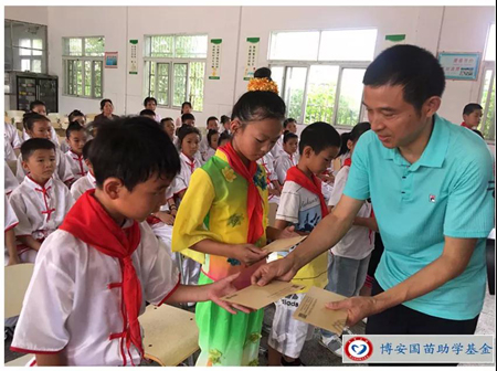 熊善清为贫困学生发放了助学金,博安国苗助学基金携手武汉图书馆向茅山中心小学捐建图书室,徐蕾向博安国苗助学基金回赠了锦旗。