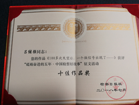 《100多次失望后,一个微信号出现了》以潜逃14年零7个月的犯罪嫌疑人蔡某最终落入法网的真实故事为背景,讲述了检察干警打击贪污腐败、维护公平正义的执着和勇气,展现了以人民检察官为代表的共产党人的公仆情怀与法治精神,让人民群众从案件中感受到公平正义。该作品在武汉市检察院“检察好故事”演讲竞赛中荣获一等奖,2017年9月8日在《检察日报》纸媒发表后,深受广大群众喜爱,先后被最高人民检察院、正义网、人民网、中国青年网、检察日报两微一端新媒体等几十家国内知名媒体转载,阅读量累计达50余万次,点赞1万余次,取得较好的传播效果,并荣获当年“中国检察好故事双月评优秀奖”。