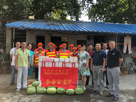 今年暑期以来,热浪滚滚,高温不退,7月30日上午,民建武汉市硚口区企业家支部会员来到汉水桥街道,在街工委书记肖波的陪同下看望慰问了坚守在一线的环卫工人。为他们送去矿泉水、酸梅膏、毛巾等防暑降温物品和最真挚,最清凉的问候,并与街干部职工进行了面对面、心连心的交谈。