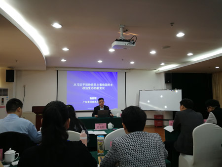 3月18日,民建界别武汉市硚口区会员郭红艳、蒋鹏、周雪、田甦、陈国祥等参加了由区政协组织的培训活动,聆听了广东省社会主义学院副院长鲁开垠以《从习近平谈协商民主看我国民主政治生态的新变化》为题作的专题讲座。