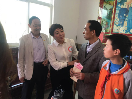 在列宁小学活动现场,两位会员向十位小学生发放了12000元助学金,并向学校捐赠了价值2万多元的科技类图书。谷晓红代表民建东西湖工委及湖北省河南商会发表了热情洋溢、感人肺腑的演讲,鼓励这些来自家庭贫困的孩子们树立远大理想,克服困难,努力学习,将来成为对国家有用的人才。她的讲话得了在场所有孩子们的热烈掌声。活动结束后,大家还来到附近一家精准扶贫户中看望村民,现场发放了2000元慰问金。随后参观红安县爱国主义教育基地,接受爱国主题教育。