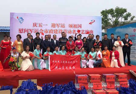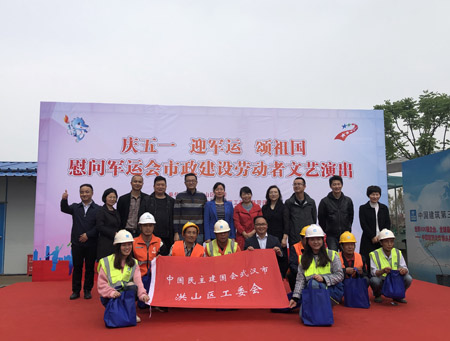 4月30日上午,民建武汉市洪山区工委在军运会重点保障项目青菱南路项目部举办主题为“庆五一 迎军运 颂祖国 慰问军运会市政建设劳动者”的文艺演出。来自洪山区南湖艺术之声的艺术团队为辛勤的劳动者们献上了精彩表演,博得满堂喝彩。洪山区委统战部副部长、区台办主任陈淑琴,洪山区建设局副局长黄萍,洪山建投董事长李超,民建洪山区工委主委姚红荣、副主委赵凯、王军振、张传华,民建爱心企业家蔡兴、沈佳丽等,和青菱黄家湖片区数个军运会保障项目的一线施工人员约200余人参加活动。