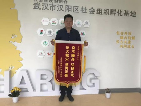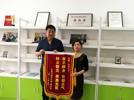 5月13日,来自汉阳区某汗蒸养生馆的章女士感激不已,紧紧握着民建武汉市汉阳区会员、清露社工中心主任张晓的手,同时送上写有“奋不顾身,弘扬正气,抢火救灾,英勇无畏”的锦旗表示感谢。