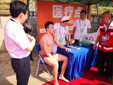 当天早上六点四十五分,王明雄已在南岸嘴抢渡终点站医疗保障点做好了准备工作。团队配备了3名医生、2名护士、2名担架员,为选手免费发放防暑降温、外伤药品,宣传游泳受伤急救知识,对选手给予基础医疗护理,引导抢渡成功的选手调节情绪、合理放松大量运动后的紧张肌肉,全力做好医疗保障工作。