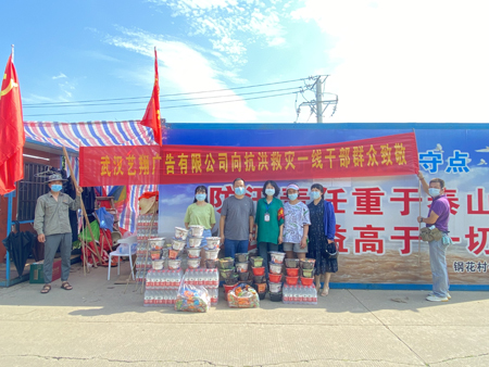 7月22日,民建青山区会员、区政协委员、武汉艺翔广告有限公司总经理朱华武带领公司员工,到钢花街防汛指挥部慰问,送去慰问物资快餐面、火腿肠和自嗨锅等,向坚守在武惠堤上的干部群众表达一份敬意。