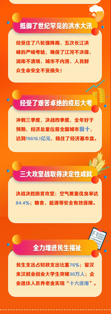 回顾过去一年,挑战前所未有,斗争艰苦卓绝,成效好于预期,打赢了气吞山河的抗疫大战,抵御了世纪罕见的洪水大汛,经受了艰苦卓绝的疫后大考。我们永远铭记,以习近平同志为核心的党中央的坚强领导和亲切关怀,汇聚了全市人民奋力夺取“双胜利”的磅礴力量。我们永远铭记,全国人民的鼎力支持和倾情奉献,充分彰显了华夏大地万众一心、命运与共的家国情怀。我们永远铭记,全市人民风雨同舟、众志成城,充分展现了英雄城市、英雄人民的坚韧、无畏、大爱和担当。