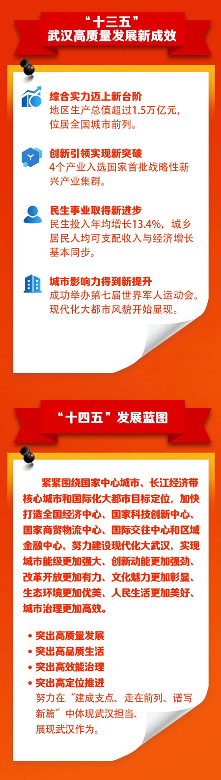 展望“十四五”发展,程用文说,今后五年,要坚持以习近平新时代中国特色社会主义思想为指导,紧紧围绕国家中心城市、长江经济带核心城市和国际化大都市目标定位,加快打造全国经济中心、国家科技创新中心、国家商贸物流中心、国际交往中心和区域金融中心,努力建设现代化大武汉,实现城市能级更加强大、创新动能更加强劲、改革开放更加有力、文化魅力更加彰显、生态环境更加优美、人民生活更加美好、城市治理更加高效,努力在“建成支点、走在前列、谱写新篇”中体现武汉担当、展现武汉作为。